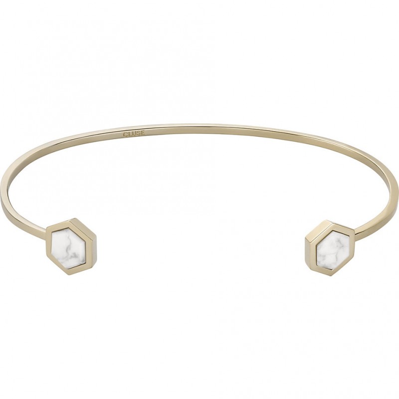 Wristband with a clean cut and a square edge in 18k gold, minimalist with a unique feature on each end: an hexagonal insert with a piece of natural white rock.