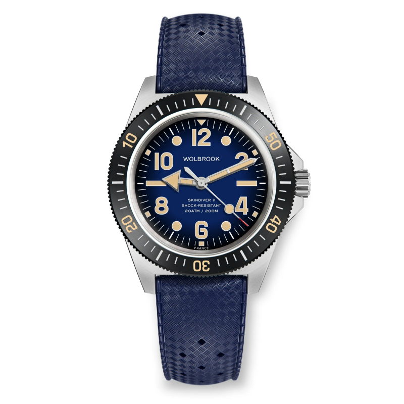 This smoked blue Skindiver II Automatic Jumbo features a gradient blue dial that fades from black at the edge to a deep oceanic blue at the center. It’s fitted with oversized “jumbo” indices coated in vintage-style "Old Radium" Super-LumiNova®, Wolbrook’s iconic arrow hour hand, a glass box sapphire crystal, and a 316L stainless steel case—water-resistant to 200 m with a screw-down crown.
