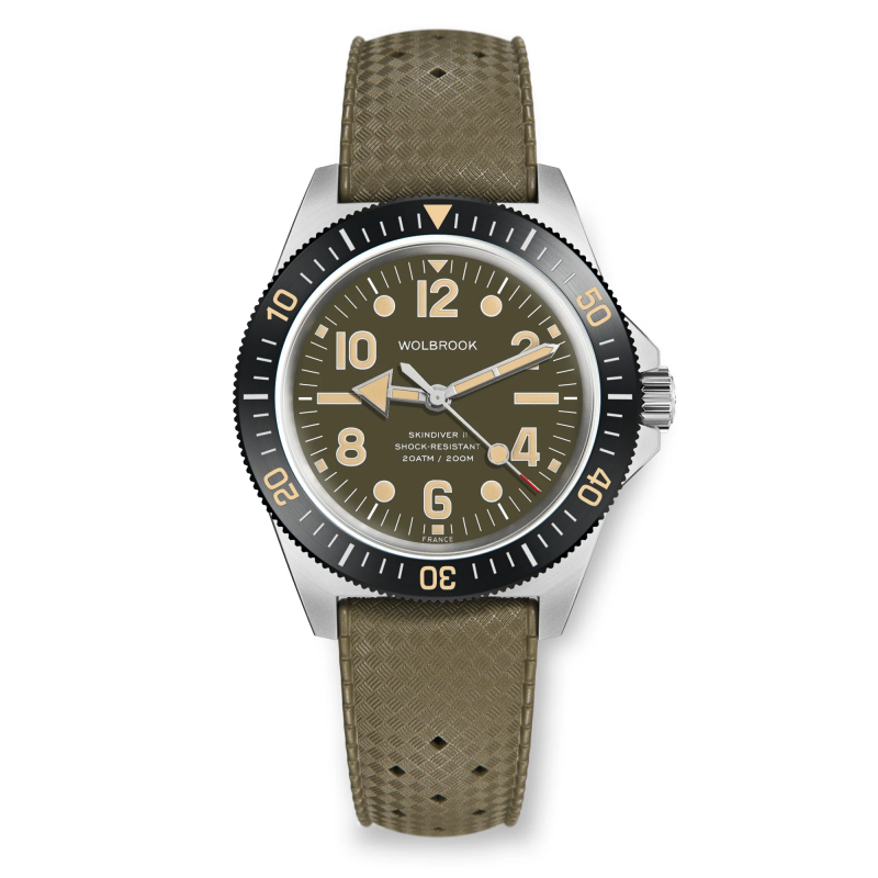 This green Skindiver II Automatic watch features a military green lacquered dial with "jumbo" indices in vintage "Old Radium" Super-LumiNova®, the Wolbrook iconic arrow hour hand, a glass box sapphire crystal, a 316L stainless steel case—water-resistant to 200 m with a screw-down crown.