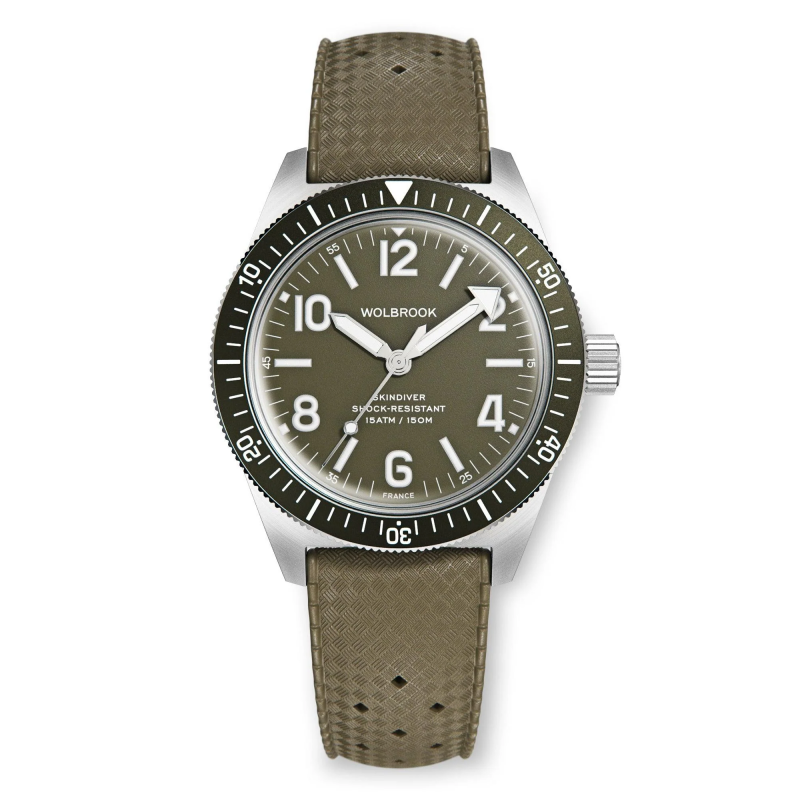 This green Skindiver Automatic watch features a French military green dial with white BGW9 Super-LumiNova®, the Wolbrook iconic minute arrow hand, a glass box sapphire crystal, a 316L steel case—water-resistant to 150 m with a screw-down crown.