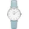 Pregiato cinturino in pelle blu carta da zucchero con fibbia argento, adatto alla linea di orologi Minuit. Cucito alla perfezione e dotato di un facile sistema di aggancio/sgancio.