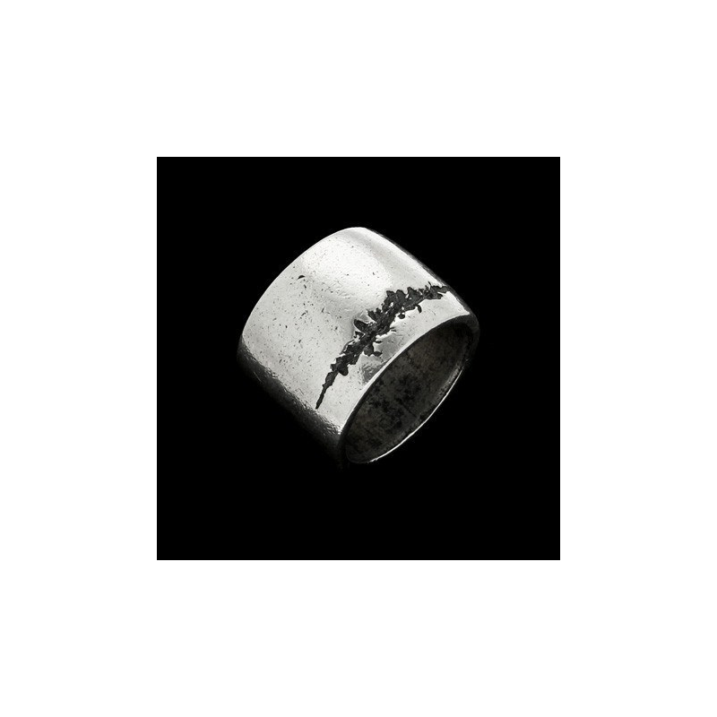 Un Gran Canyon d'Argento. Un anello a fascia larga ed ampia con logo brunito e sottili fresature ad imitare la dura roccia. Finitura brunita ed anticata opaca.